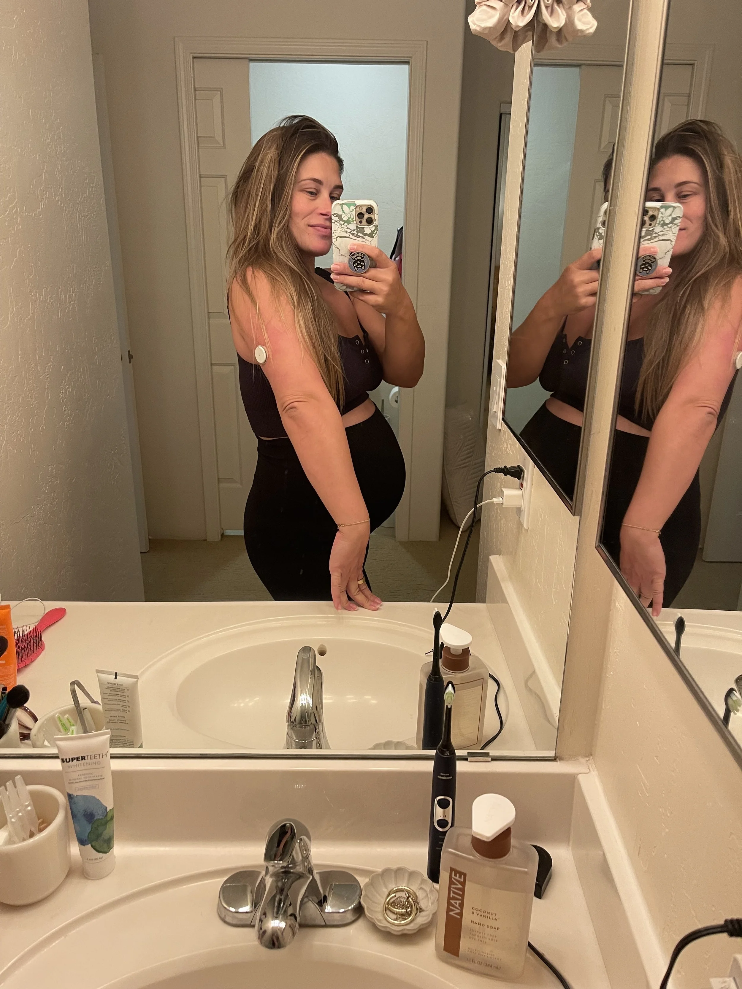 So far, no stretch marks, and my belly is tracking right on size, BTW. I’m not one of those pregnant women with a teeeeeny tiny belly. And I know I’m only one person, but last time I posted about this on my Instagram, I had countless people respond directly and say it also worked wonders for them.